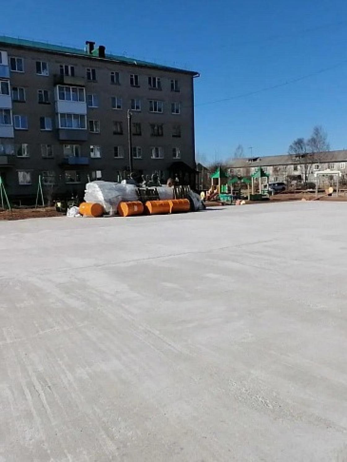 В поселке Луковецкий Холмогорского округа обустраивают полиуретановое покрытие детской спортплощадки