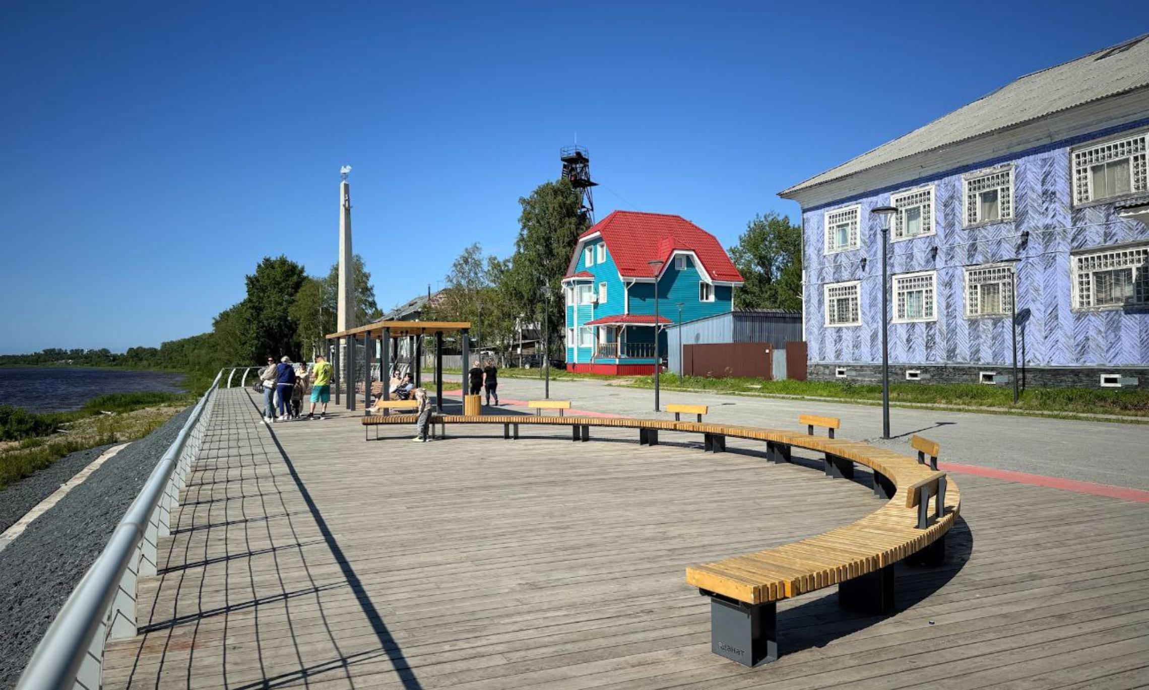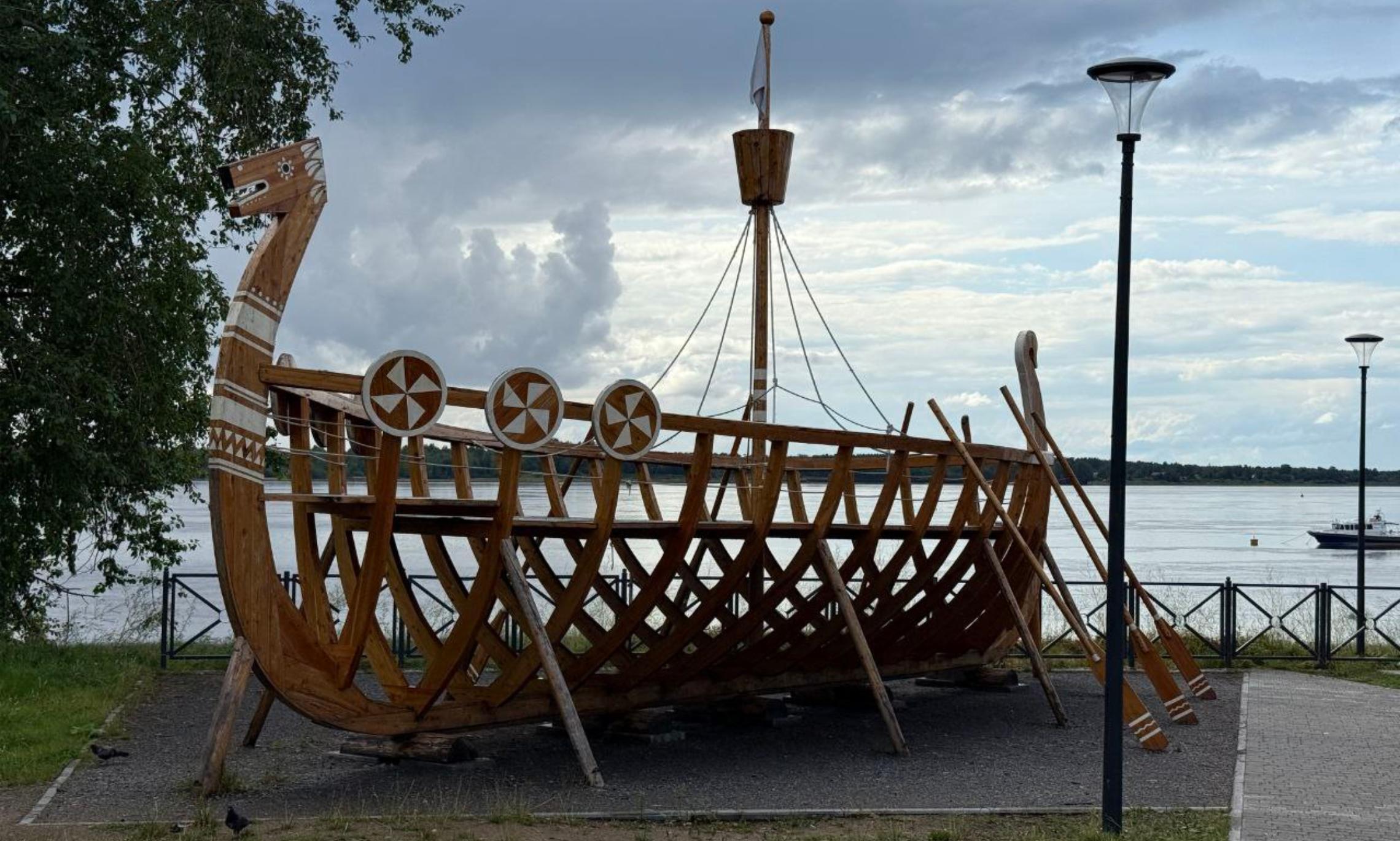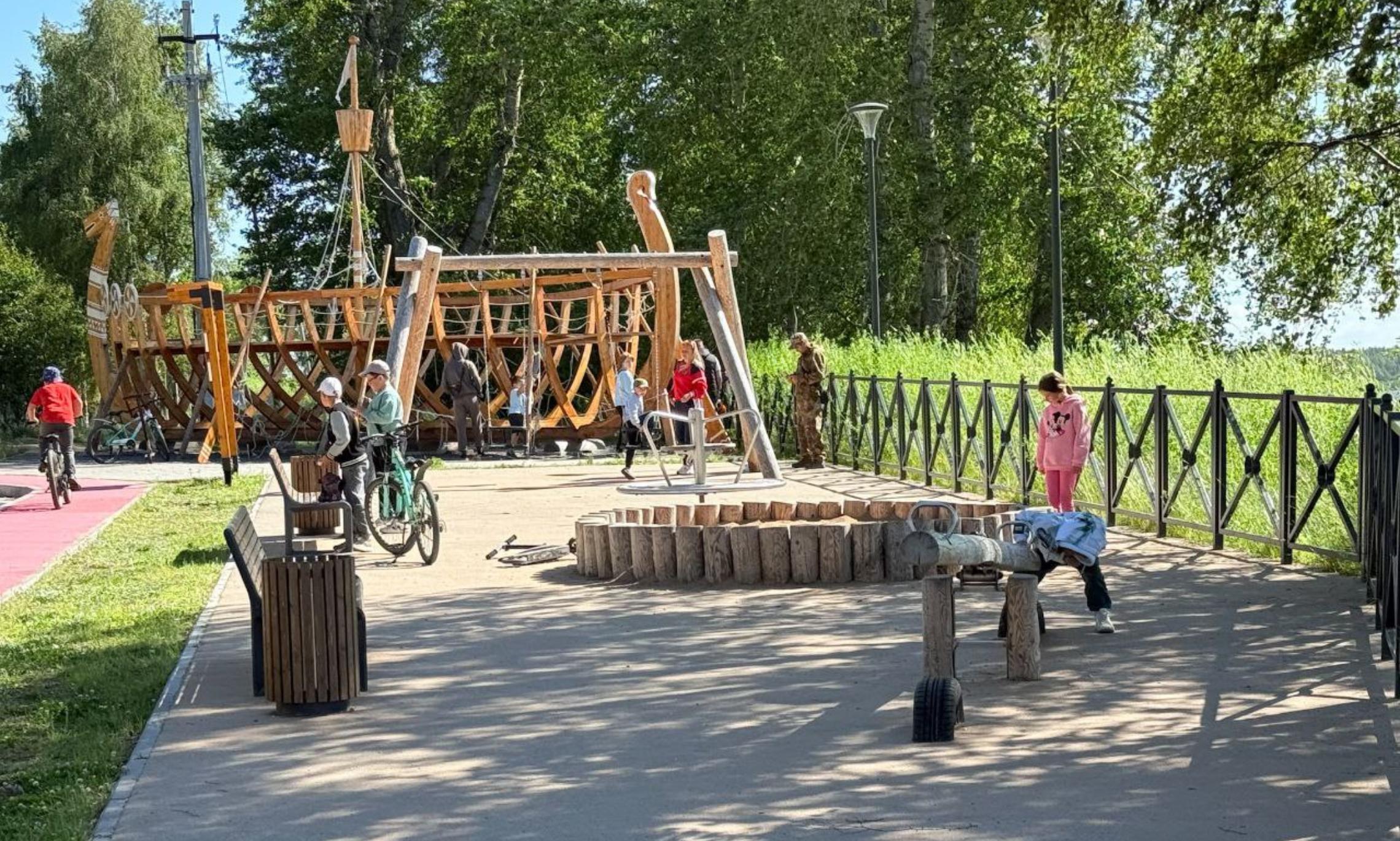 Здесь укрепили берег, расширили набережную, сделали смотровые площадки с навесами, качелями и скамейками, установили детскую площадку и арт-объект — большую ладью, проложили велодорожки и пешеходные настилы, смонтировали современное освещение.