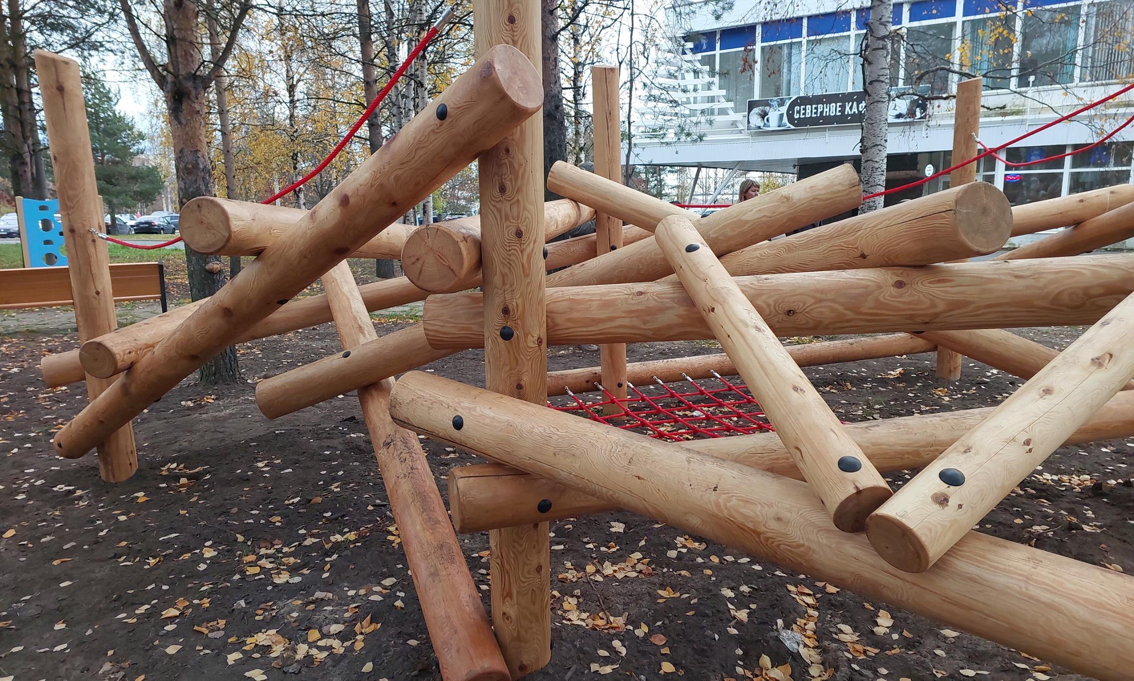 Особое внимание в сквере уделено детскому досугу. Здесь установили необычные игровые элементы для дошкольников, выполненные из пропитанной лиственницы. Комплекс включает ступеньки, балансиры и площадку «Бурелом». Рядом оборудованы скамейки для семейного отдыха — всё это расположено среди крупных деревьев разных пород с видом на реку.