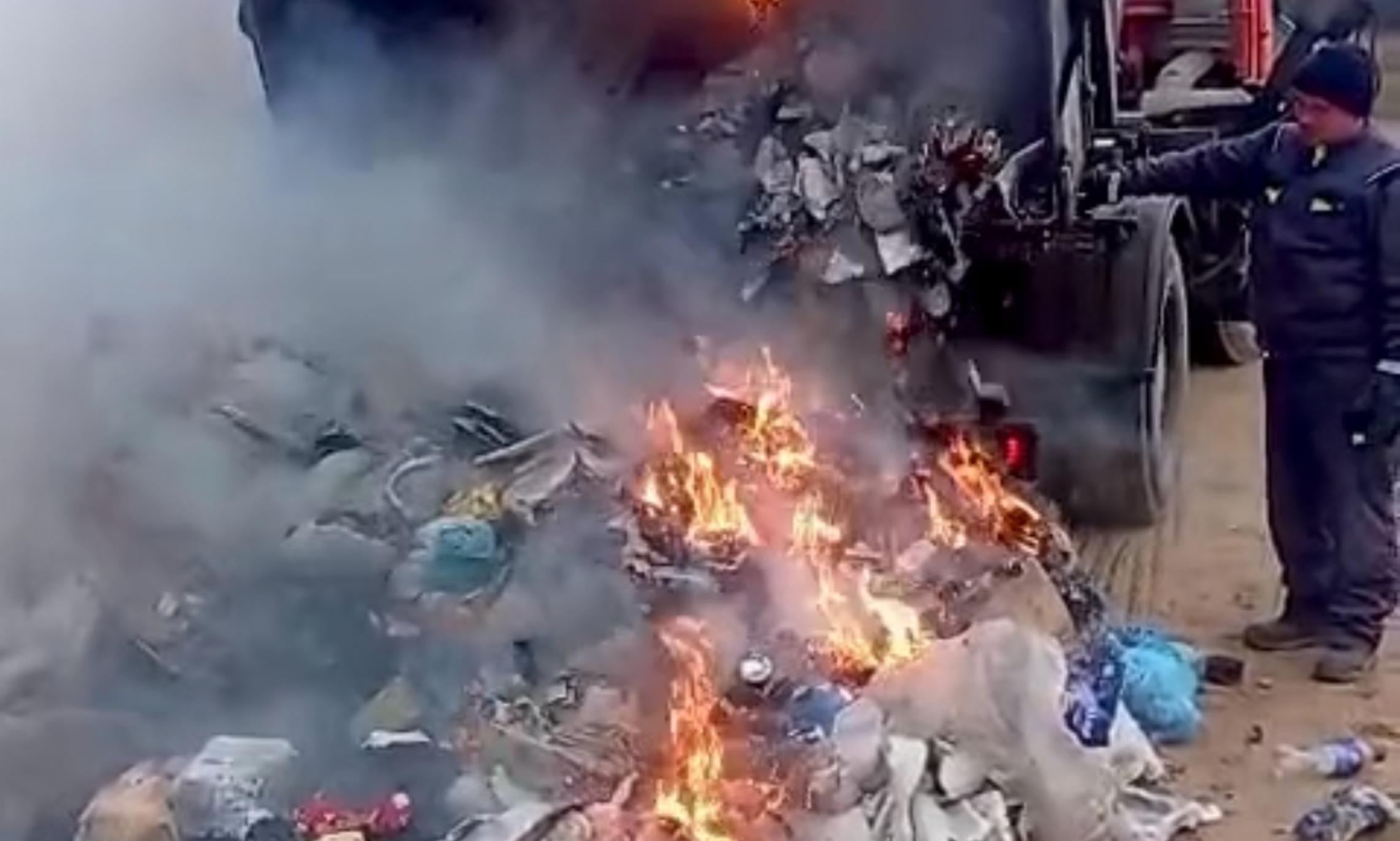Экипаж мусоровоза через открытое окно почувствовал запах гари и сделал аварийную остановку. Выгружать горящий мусор пришлось прямо на дорогу.