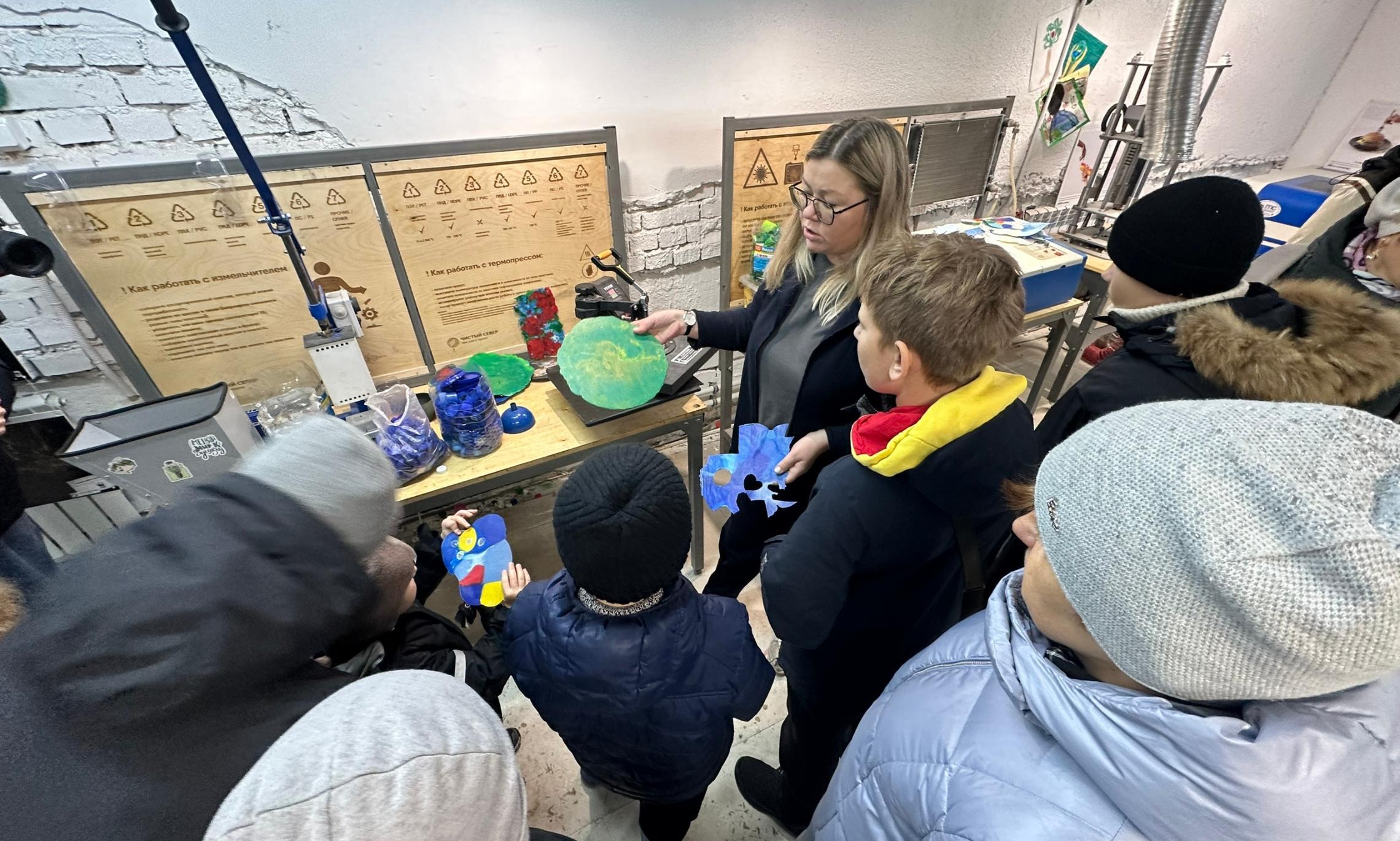 Продолжилась экскурсия в мастерской по переработке пластика движения «Чистый Север — чистая страна». Здесь дети своими руками переработали пластиковые крышечки. Они сделали заготовки для будущих изделий.
