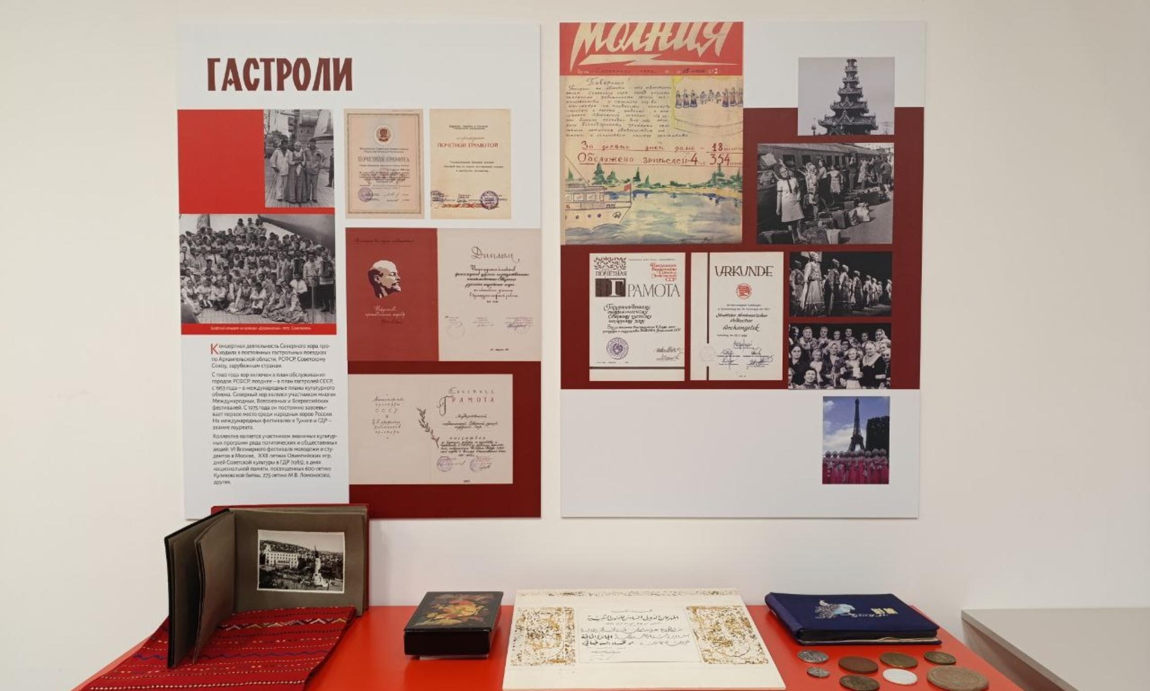 — В экспозиции нам было важно показать богатые истоки нашей северной русской народной культуры, из которой выросло такое уникальное явление как Северный хор. В тематических разделах отражены все основные периоды работы хора, показаны руководители и артисты, внесшие свой вклад в развитие хора и народных песенных традиций Русского Севера. Отдельно уделено внимание репертуару хора, его золотому фонду и современному периоду работы коллектива, — рассказала директор Северного хора Наталья Асадчик.