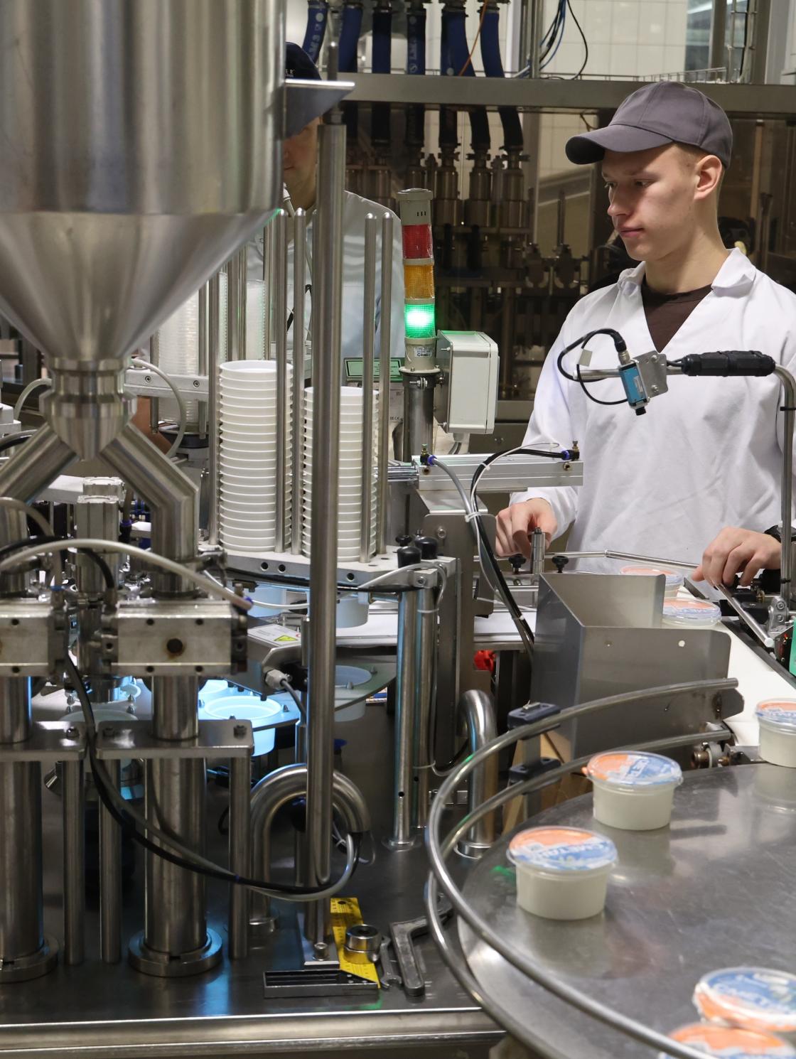 На предприятии мы были в день выпуска кисломолочной продукции. В такие дни на предприятии упаковывают детский творог жирностью 9%, взрослый творог с жирностью 5%, сметану, снежок, йогурт и кефир, в том числе особенный — детский, для малышей в возрасте от 8 месяцев.