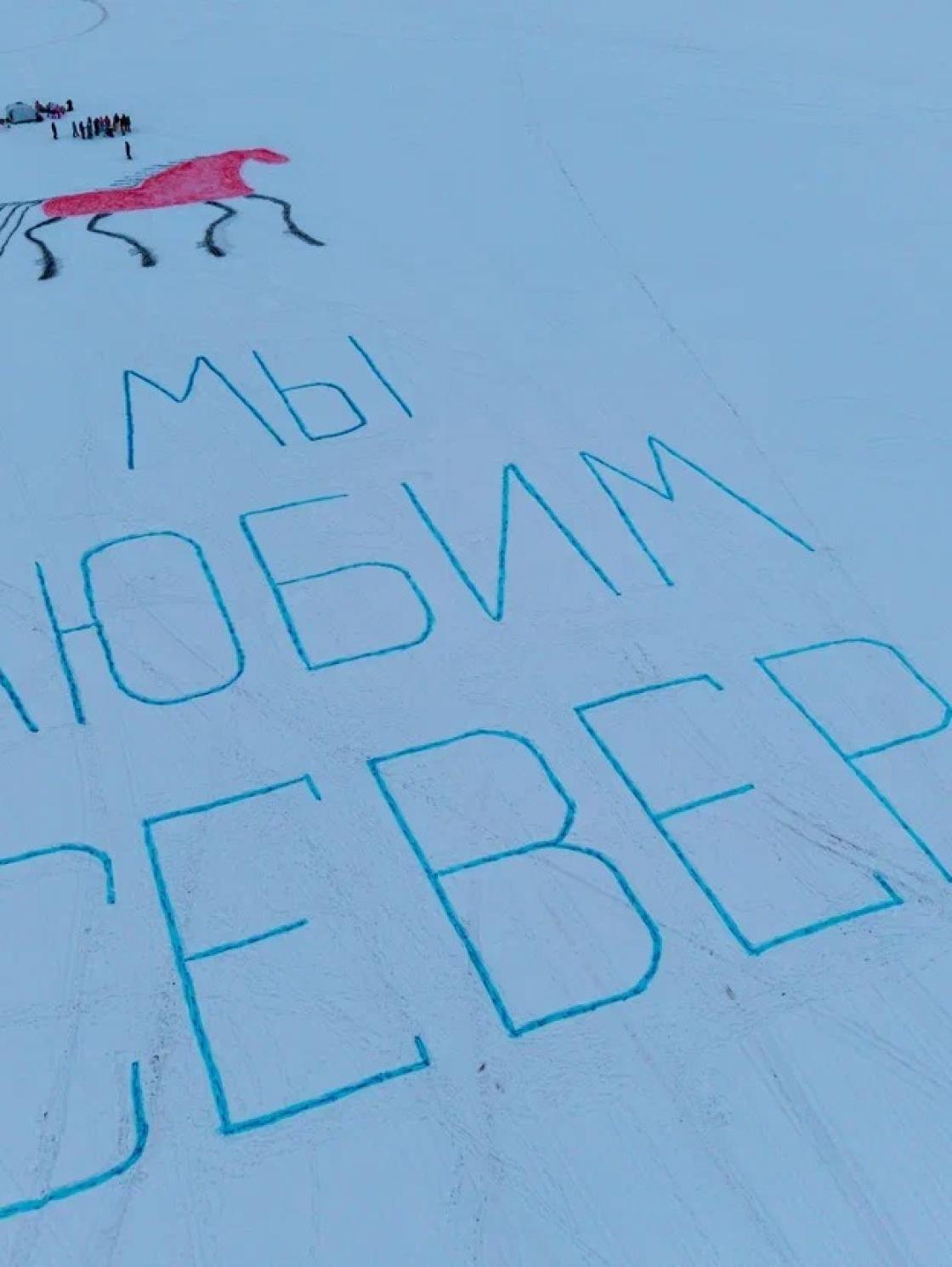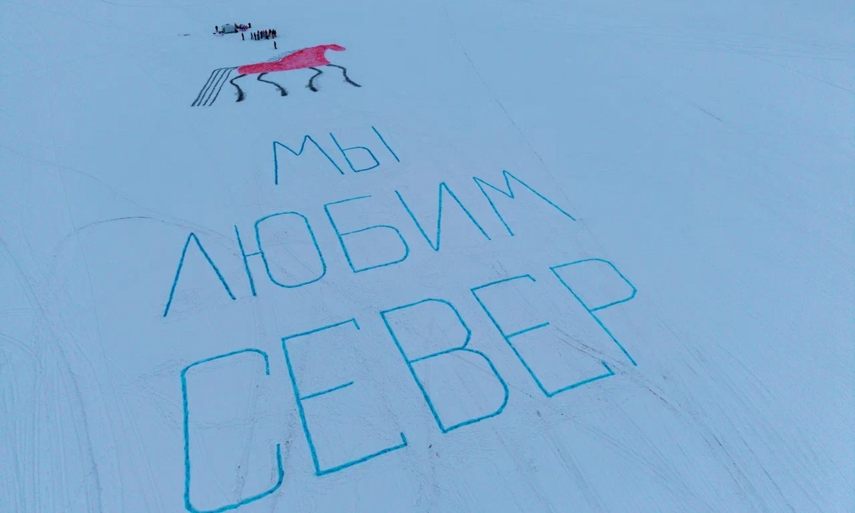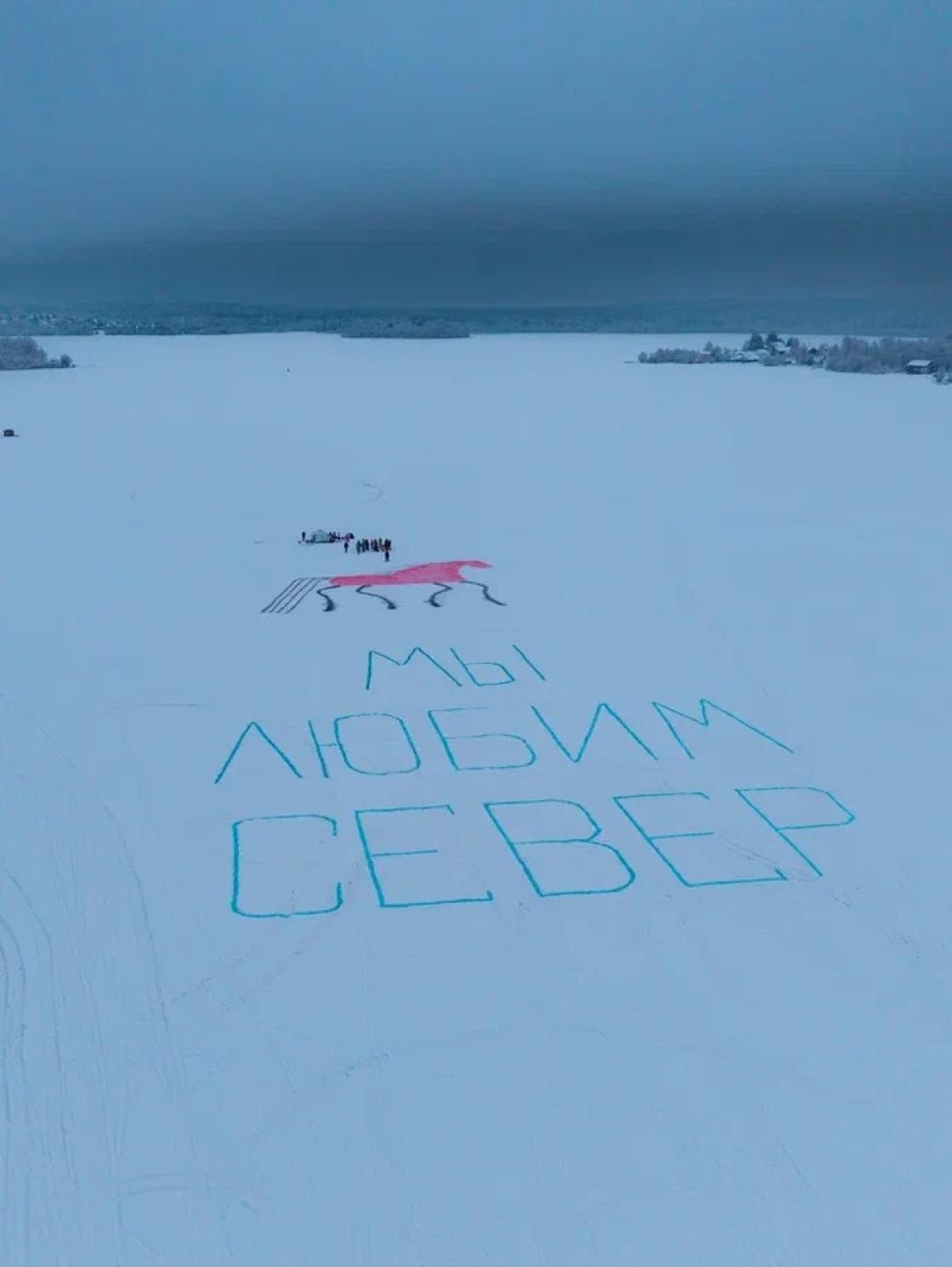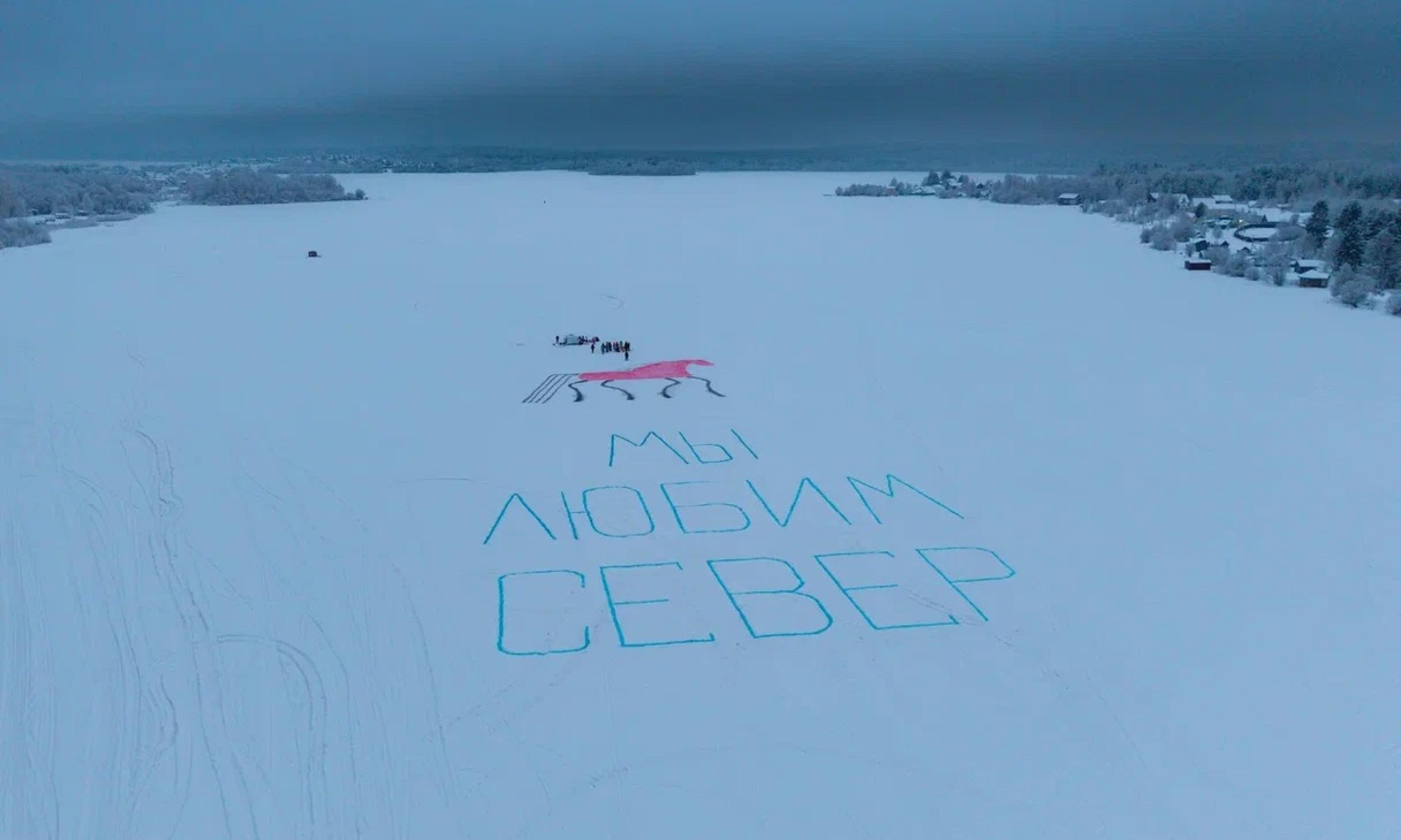 9 января ледяная гладь озера Лахта под Архангельском превратилась в гигантский холст, где расцвёл сказочный «мезенский» конь и признание в любви — «Мы любим Север».