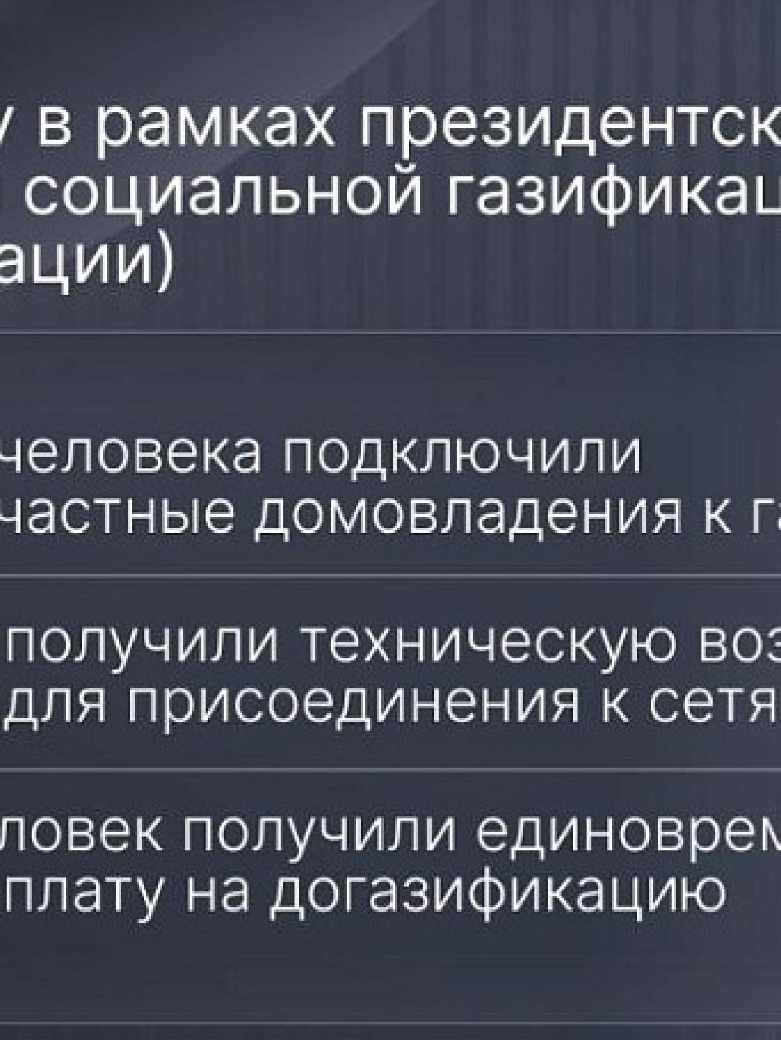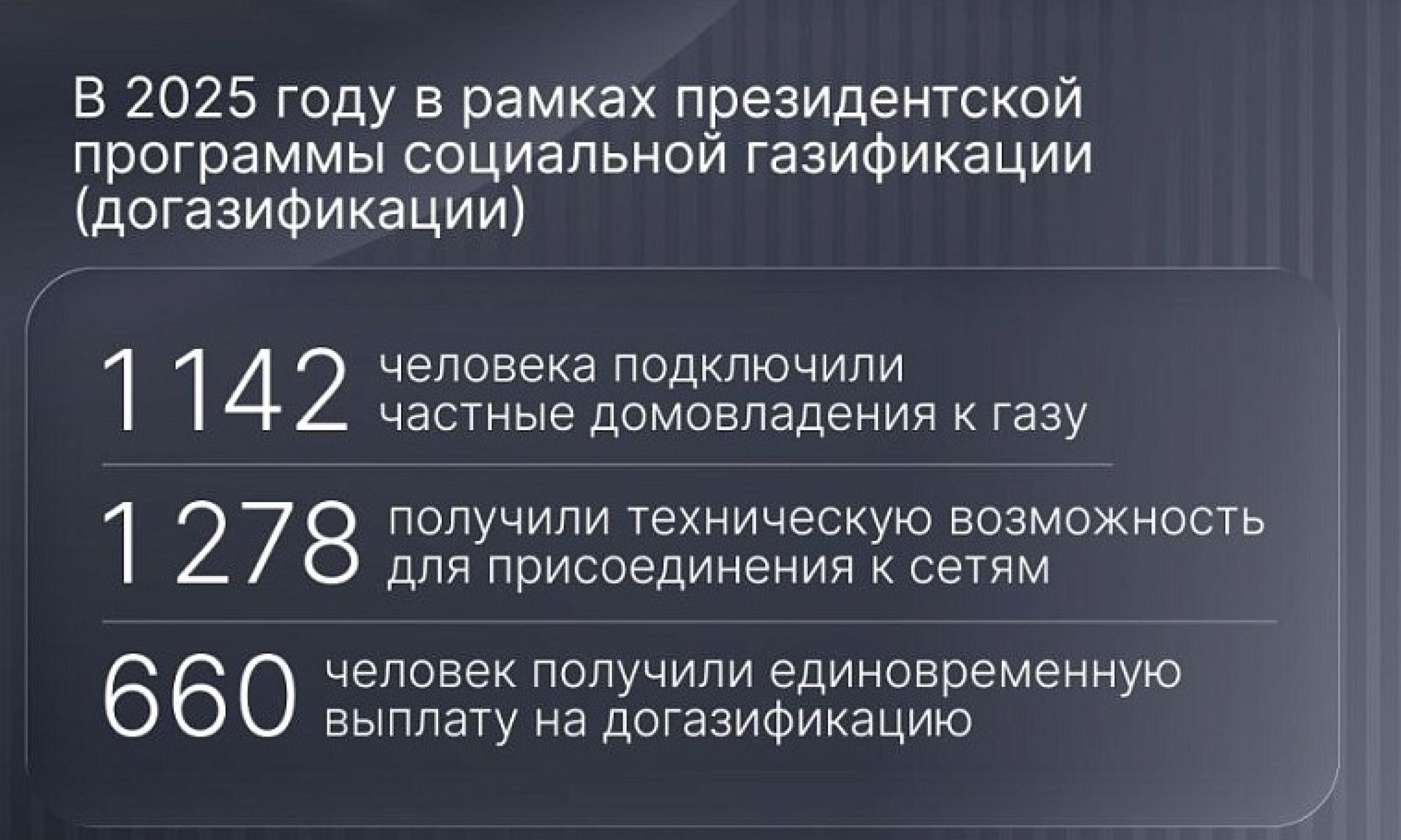 В прошлом году 1142 человека начали использовать голубое топливо в быту. Работы по созданию технической возможности для присоединения к газовым сетям завершены для ещё 1278 домовладений — газопроводы подведены непосредственно к границам их участков.