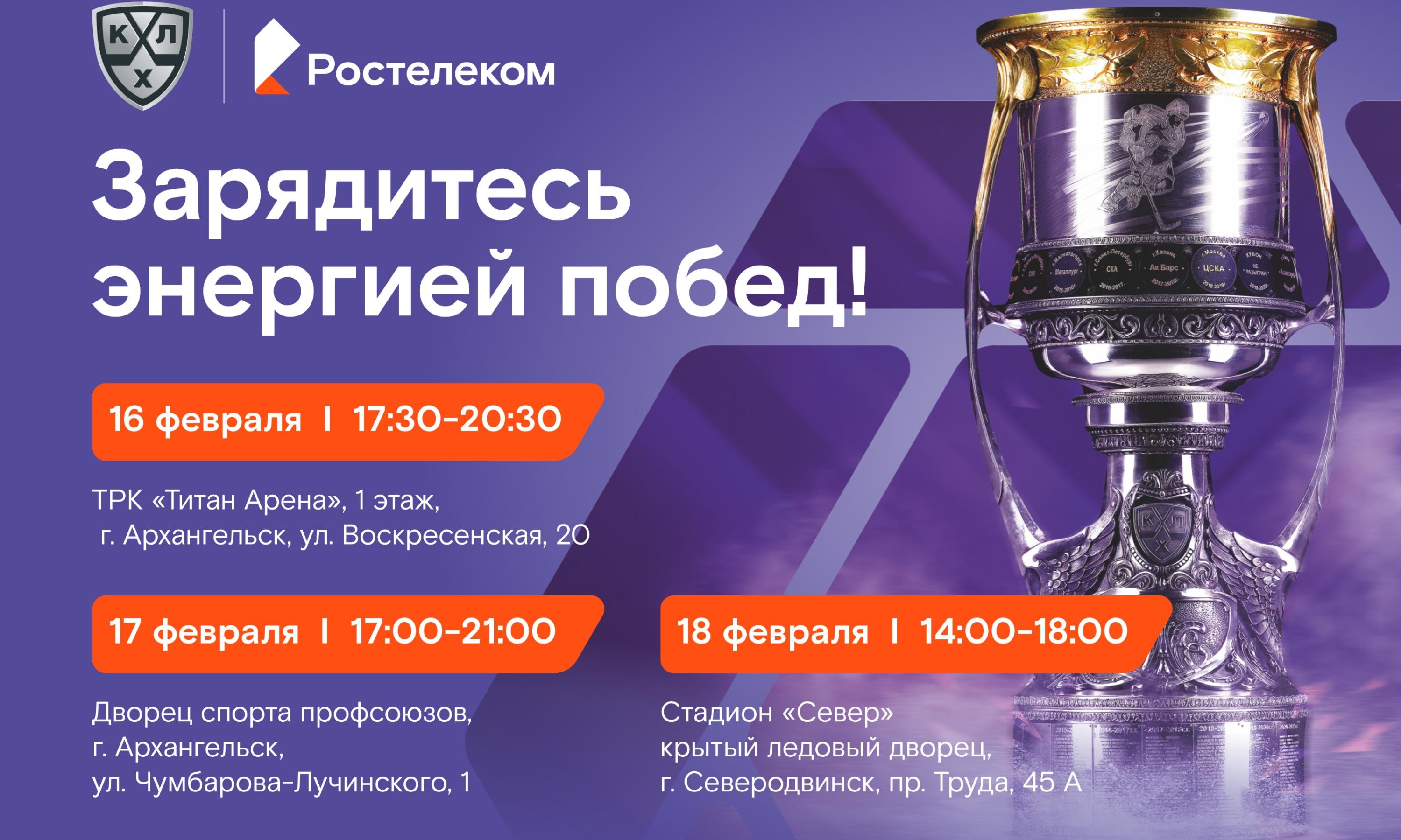 Главный трофей Чемпионата Континентальной хоккейной лиги станет героем телевизионных программ на архангельском телевидении ГТРК «Поморье». Сфотографироваться с Кубком все желающие смогут 16 февраля в ТРЦ «Титан Арена», на ледовой арене торгово-развлекательного центра состоится товарищеский матч между детским хоккейными командами, гость тура Сергей Андронов проведет мастер-класс для начинающих спортсменов. Гости праздника смогут проверить свои знания в квизах и получить памятные призы.