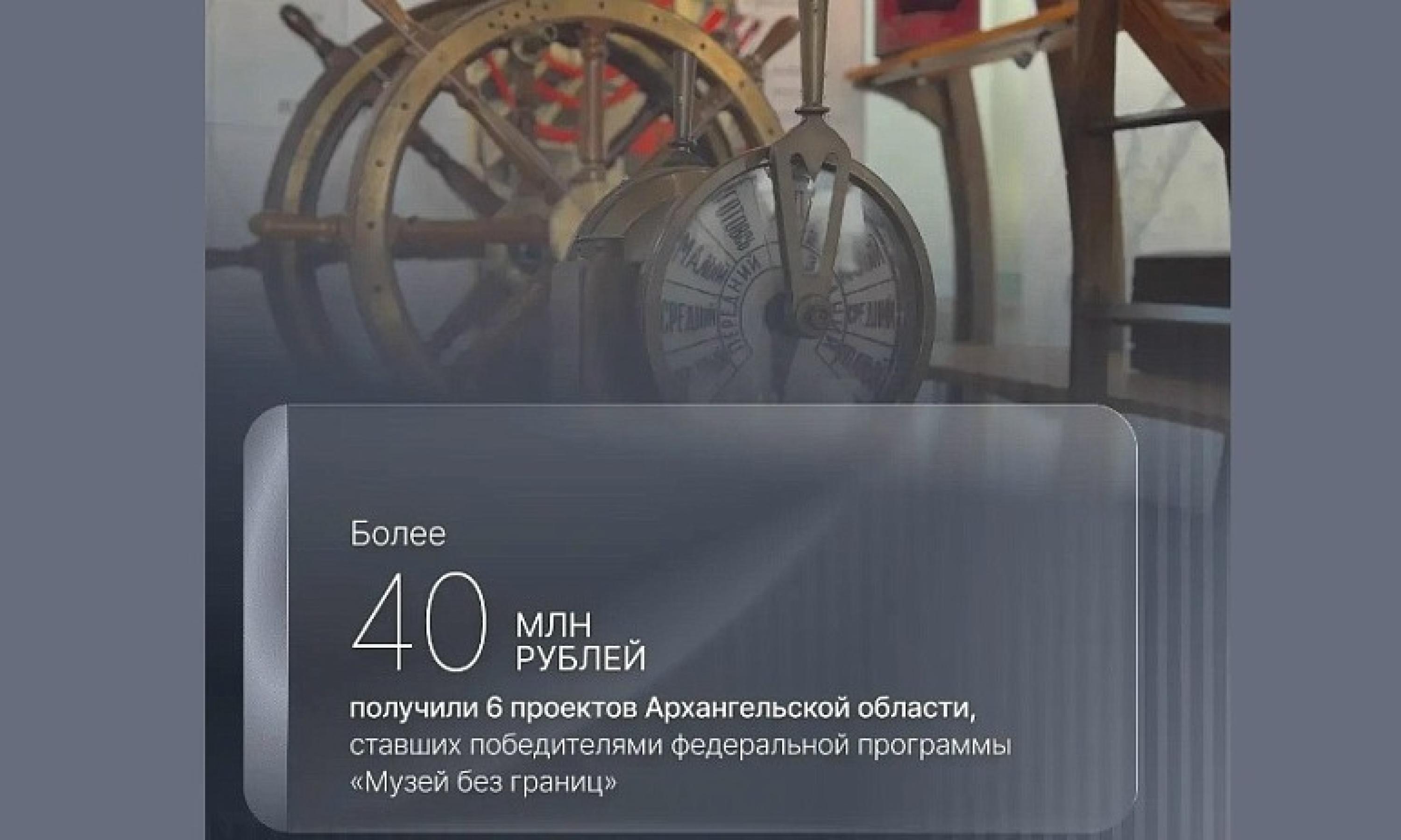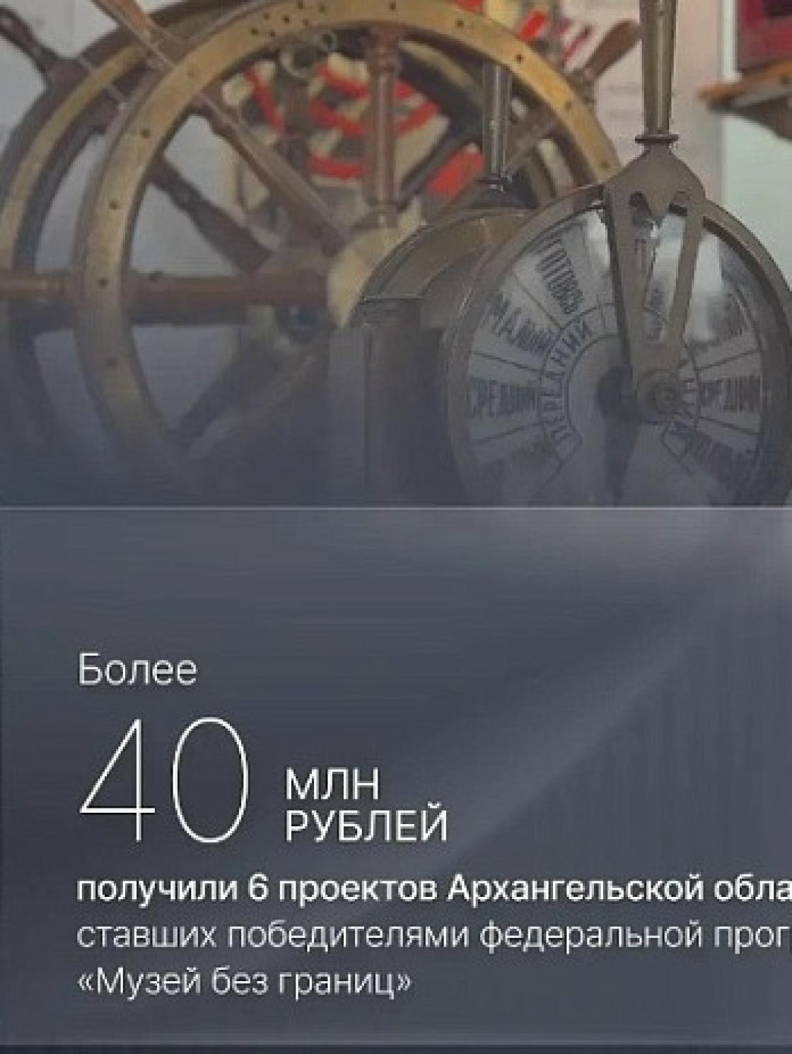 — Шесть проектов Архангельской области стали победителями федеральной программы «Музей без границ» Фонда Потанина. По итогам конкурса Архангельский краеведческий музей, Каргопольский музей, Северодвинский городской краеведческий музей, Государственное музейное объединение «Художественная культура Русского Севера», Ассоциация «Клуб друзей Кенозерского национального парка» и Северный морской музей получили гранты на общую сумму более 40 млн рублей, — написал глава региона.