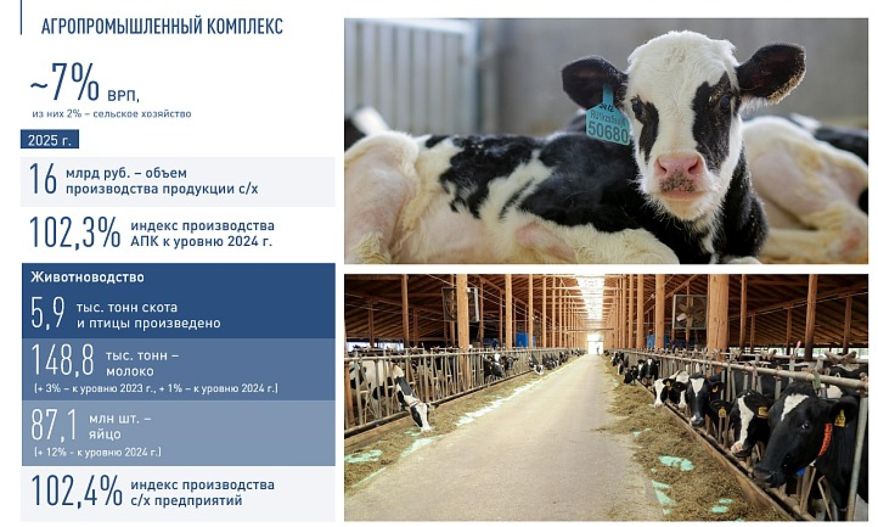 Объем производства сельхозпродукции достиг 16 миллиардов рублей, индекс производства превысил 102 процента. В хозяйствах произвели 5,9 тысячи тонн скота и птицы, производство молока достигло почти 149 тысяч тонн (плюс 3 процента к 2023 году), производство яйца выросло на 12 процентов и составило 87 миллионов штук. Молочная продуктивность племенного стада составила 10 286 килограммов на корову, увеличившись на 2 процента, а средний надой в сельхозорганизациях приблизился к 9 тысячам килограммов.