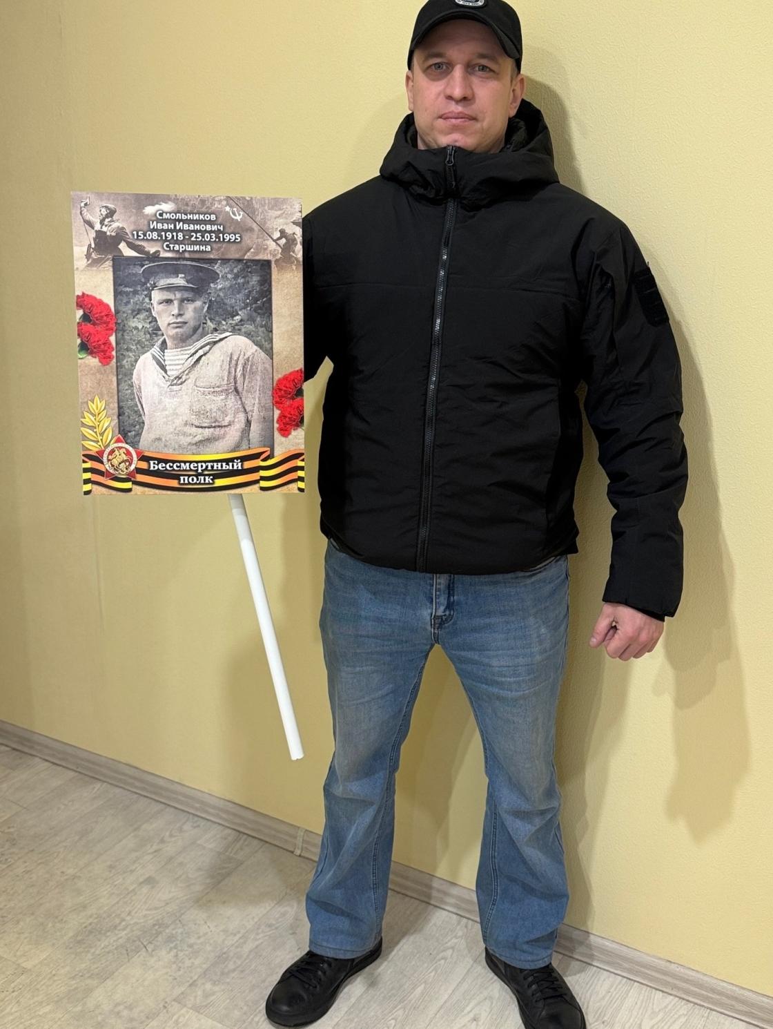 Архангелогородец Александр Смольников пройдет в Бессмертном полку с портретом своего деда – Ивана Ивановича Смольникова. Краснофлотец, затем старшина Иван Смольников служил рулевым на подводной лодке Л-15 Северного флота. В сентябре 1942 – мае 1943 года в составе экипажа подлодки совершил трансокеанский переход из Петропавловска-на-Камчатке через Панамский канал, Исландию и Великобританию – в Полярный. В ходе похода в Тихом океане своевременно обнаружил атаку японской подводной лодки. На переходе из Канады в Рейкъявик в условиях шторма в зимней Атлантике, рискуя жизнью, в водолазном костюме выполнил ремонт вертикально руля. За этот подвиг награжден орденом Отечественной войны 2-й степени. Участвовал в 7 боевых походах, в ходе которых было выполнено 4 торпедных атаки кораблей и судов противника, осуществлено 4 минных постановки у берегов оккупированной немцами Норвегии. В походах обеспечивал бесперебойное управление кораблем, проявив мужество и героизм. Награжден медалью «За отвагу». Также удостоен медалей «За оборону советского Заполярья», «За победу над Германией в Великой Отечественной войне 1941-1945 годов».